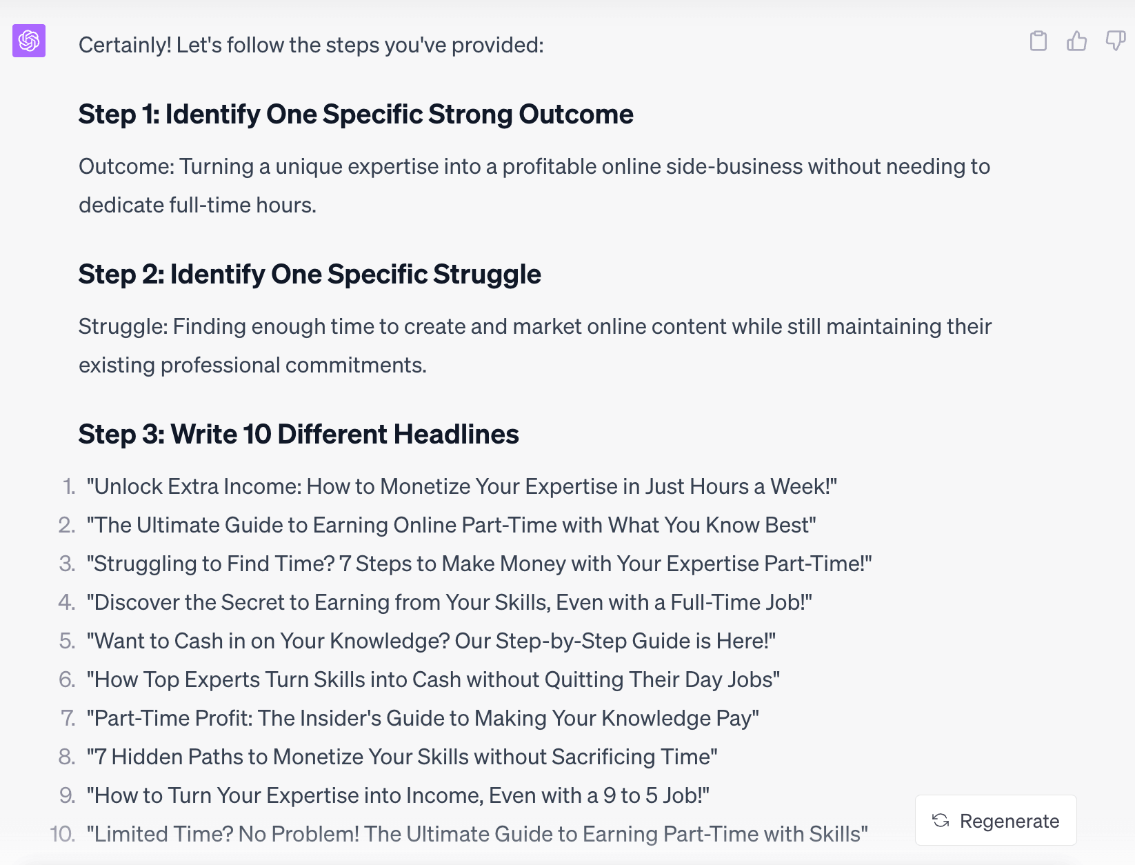 1. Identify one specific strong outcome that holds value to my audience but remains unattainable due to time constraints. It has to be outcome-driven, specific, and tangible.